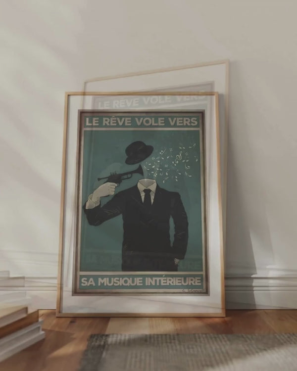 Traumhafte Anzeige im schwarzen und Jazz-Stil: eine kraftvolle Metapher für den kreativen Schwung, der von innen kommt, verbunden mit dem Wortspiel revolver / Traum fliegt zu.