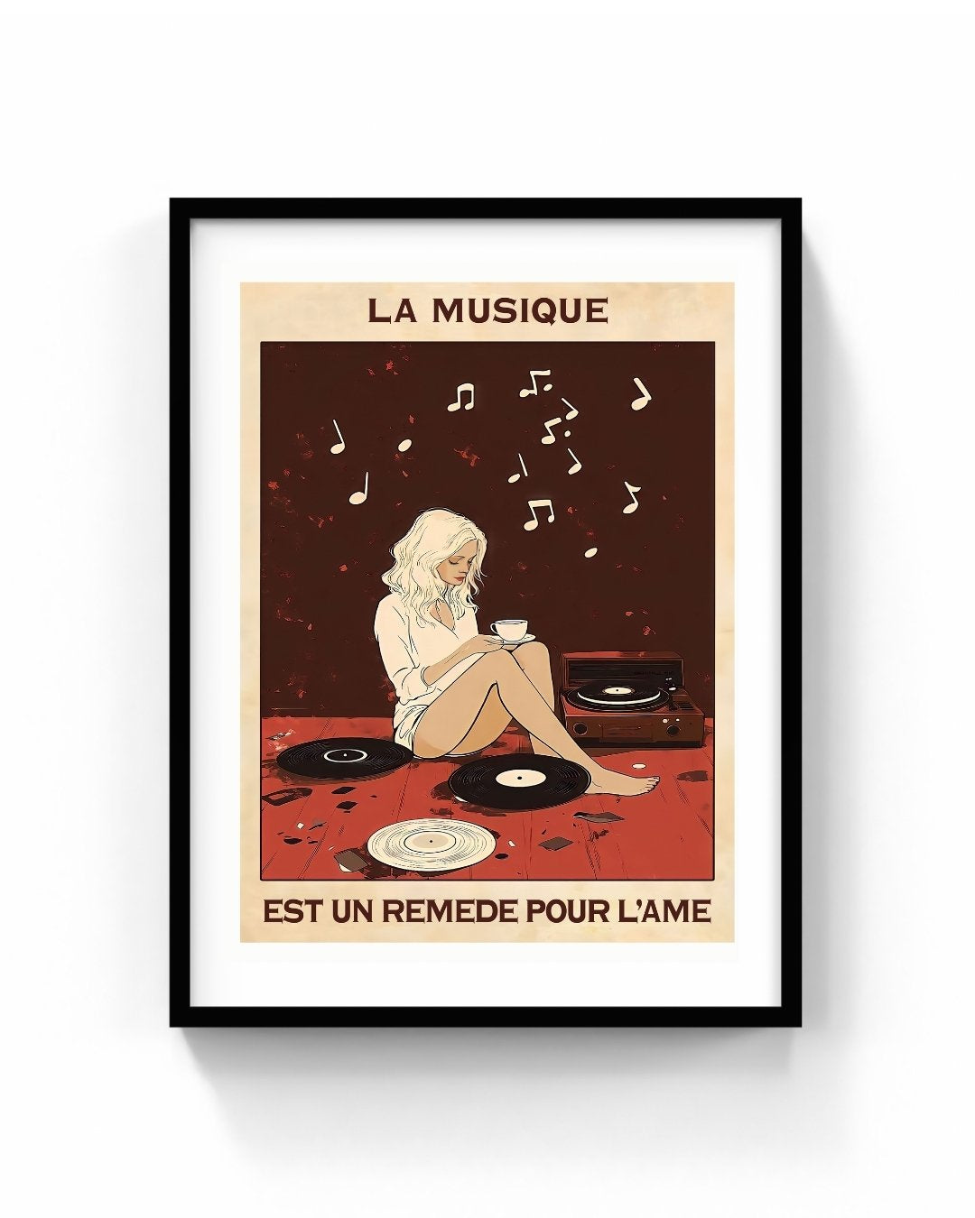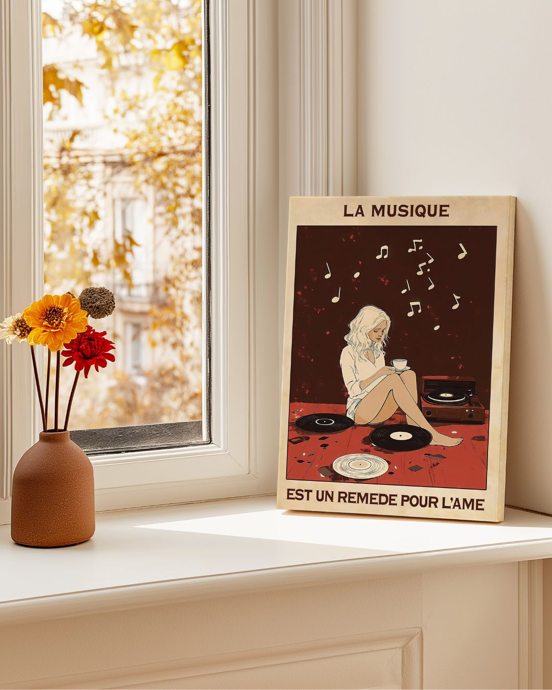Scattered vinyl records, warm cup in hand: the moment when the notes gently heal everything.