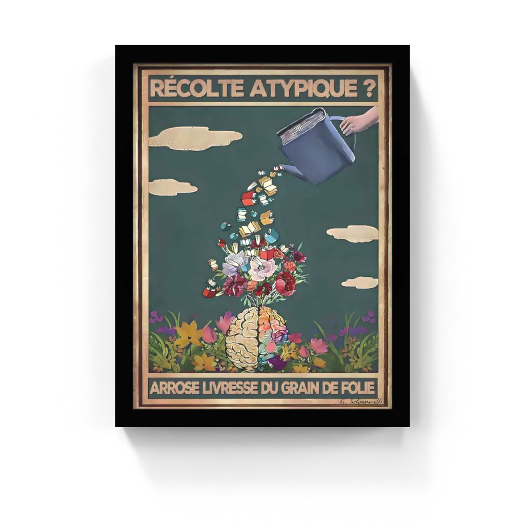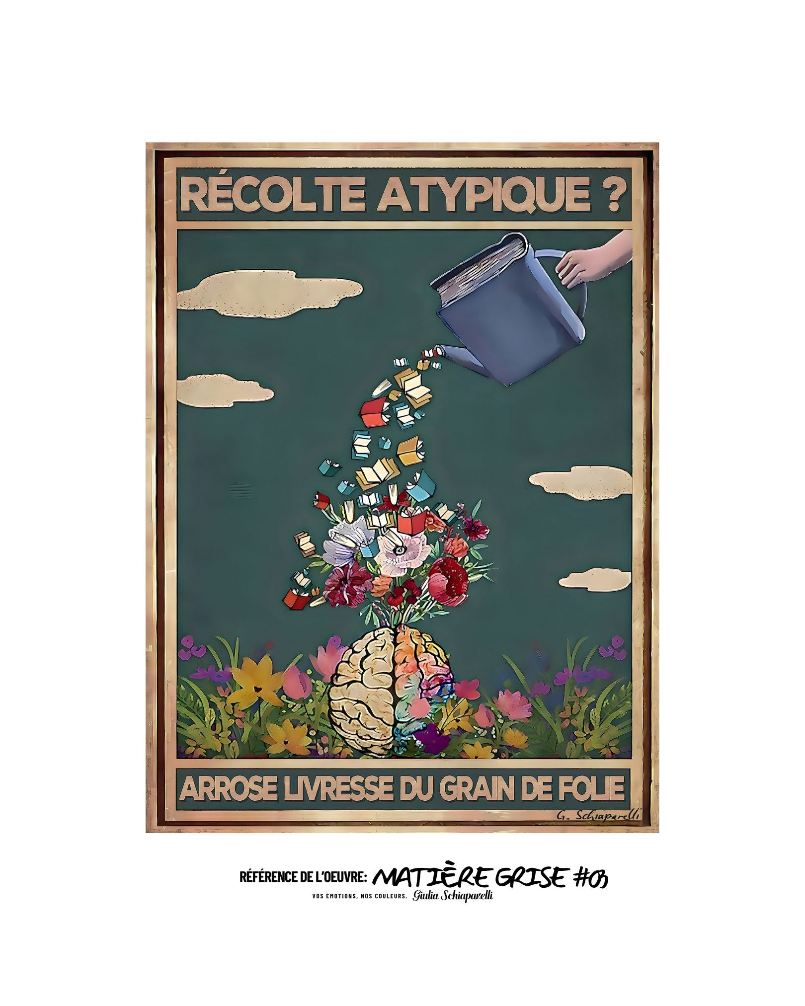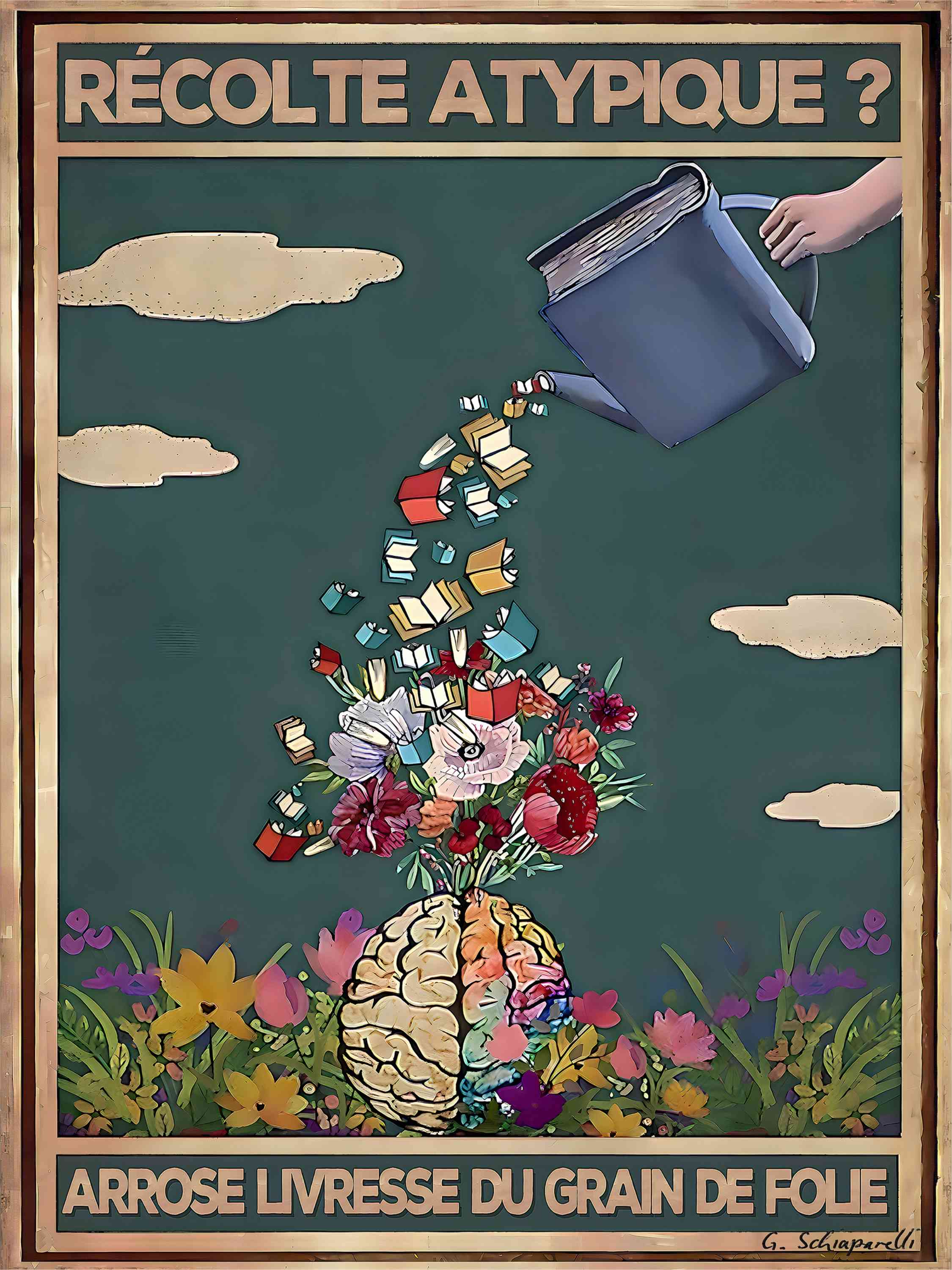 Este lienzo original simboliza la importancia de alimentar nuestra mente con conocimientos, mientras abrazamos nuestro lado atípico y creativo. La regadera que riega un cerebro con libros en lugar de agua, ilustra que la embriaguez del conocimiento es tan esencial como el agua para hacer florecer nuestro potencial. El juego de palabras ingenioso entre "libro" y "embriaguez" recuerda que alimentar nuestra mente con lecturas enriquecedoras y una dosis de locura es la clave para cosechar ideas atípicas e innovadoras.