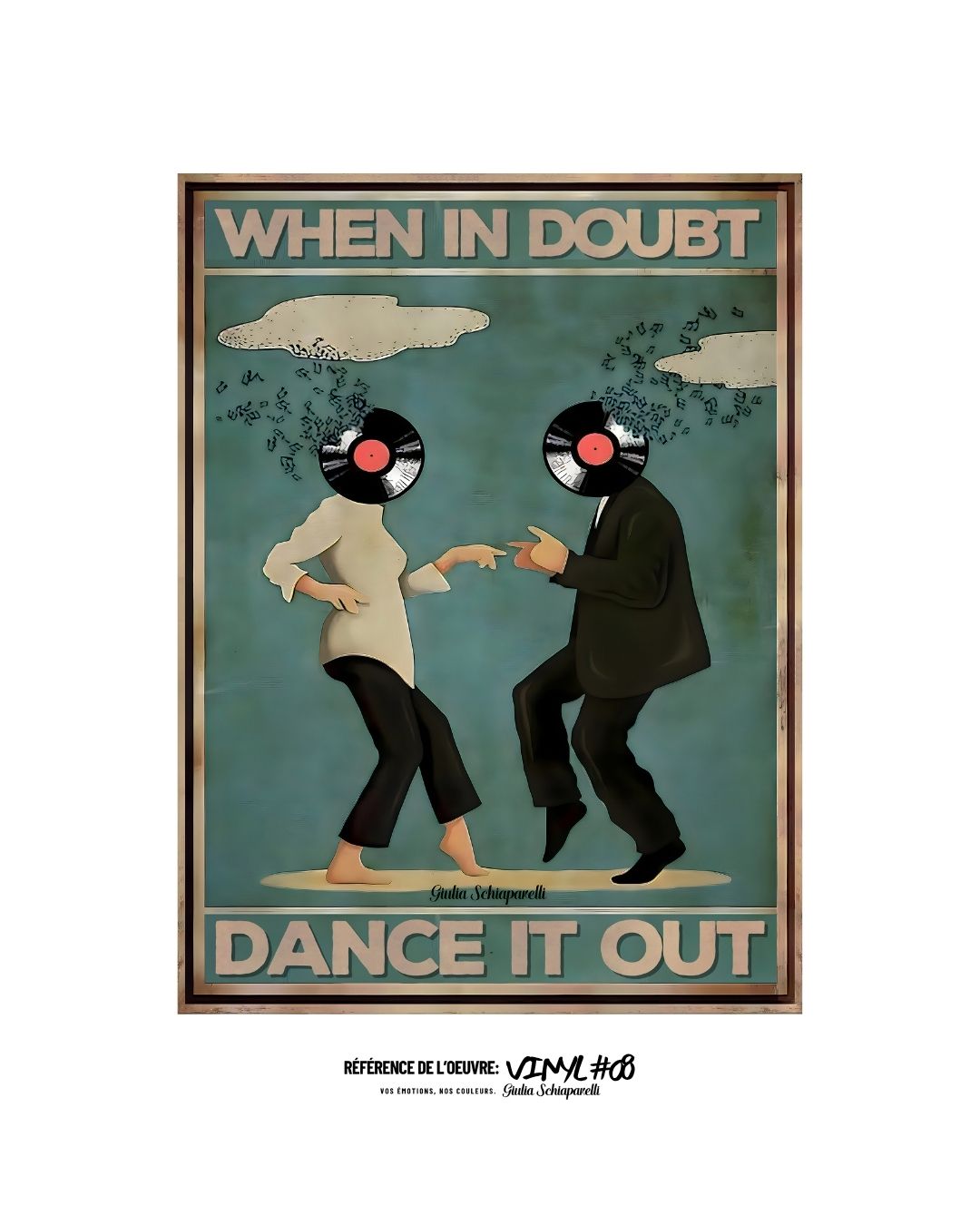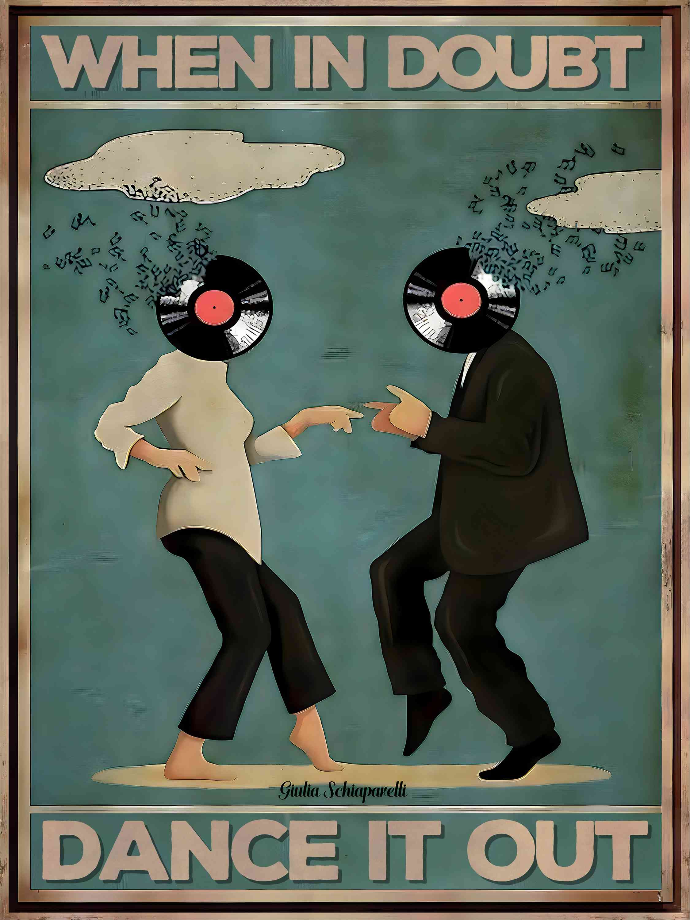 Esta cita, 'En caso de duda, baila', nos recuerda que cuando faltan las palabras o los pensamientos se confunden, a veces solo hace falta moverse. El baile es una expresión pura, una manera de liberar la mente y recuperar la claridad. Cuando la vida se vuelve confusa, deja que tu cuerpo se deje llevar por el ritmo y siente la magia del momento. Este lienzo es una celebración de dejarse llevar y de la alegría espontánea.