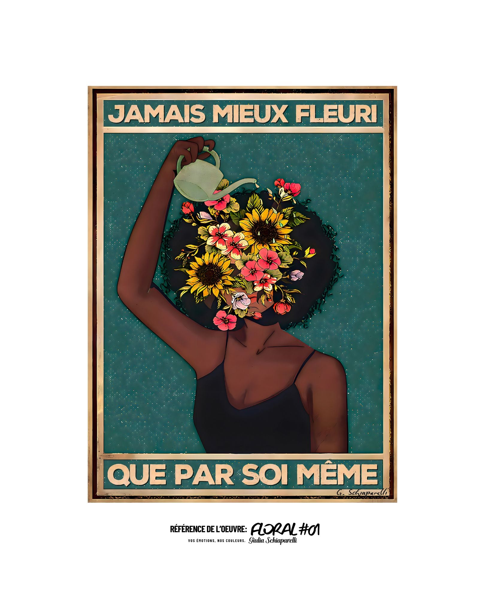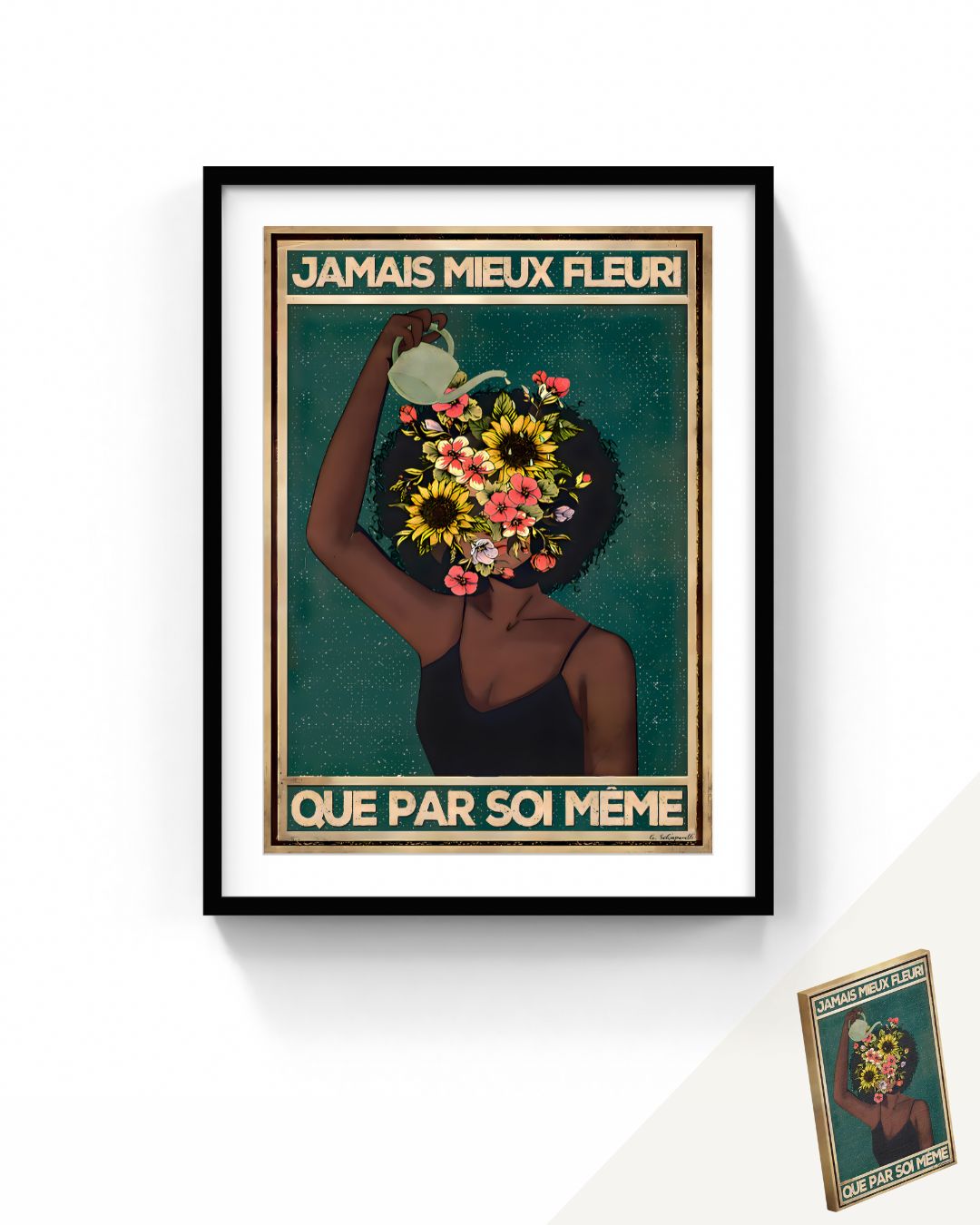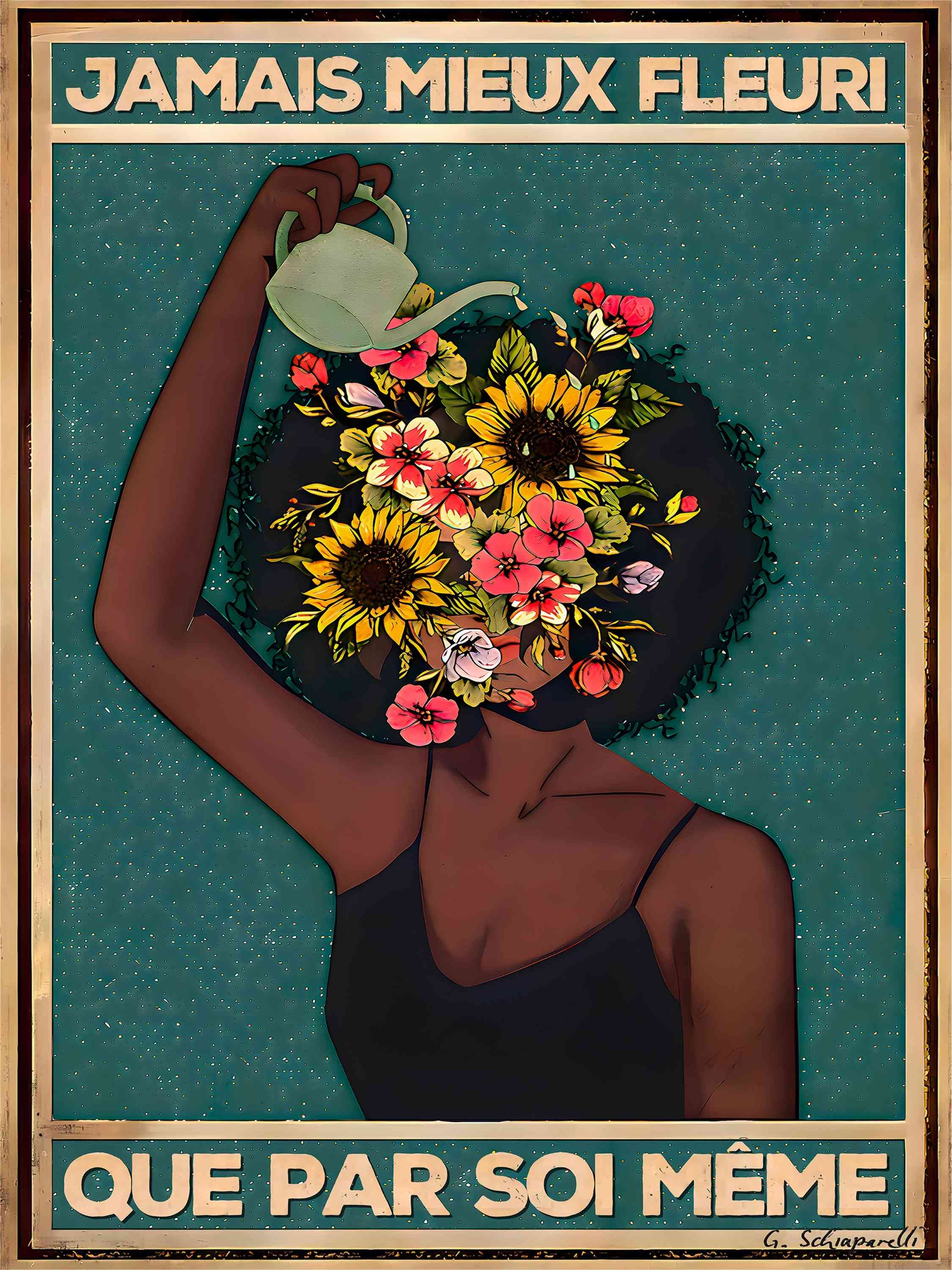 Esta cita, un guiño al adagio "Siempre mejor servido que por uno mismo", nos recuerda que nuestro crecimiento personal proviene principalmente del interior. Al igual que este sujeto regándose la cabeza para dejar florecer su belleza interior, tómese el tiempo para nutrirse, quererse y celebrar cada progreso. Es un recordatorio diario de que el desarrollo personal es un viaje continuo, y que tienes la clave de tu propio crecimiento.